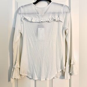 Elegant white top with ruffle details. Button-up front. Long sleeves with ruffled cuffs.
