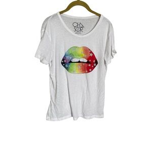 White t-shirt featuring a vibrant rainbow lips graphic. Perfect for casual wear. Preowned. No flaws. Pit to pit 17.5” Length 24” JE225