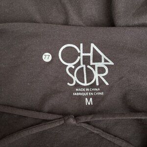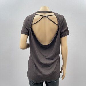 Tags: Chaser, women's tee, graphic tee, open back shirt, strappy back, casual wear, cotton blend, lip print, short sleeves, black tee, red lips, medium size, crew neck