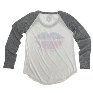 Chaser Womens Medium Raglan Long Sleeve Lightweight Thin Fabric Graphic T-Shirt. Gray and White With Lips and "kissing in the U.S.A."