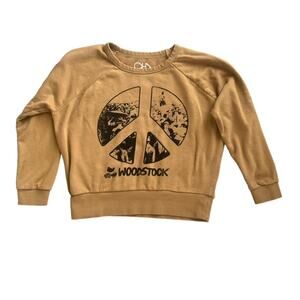Tags- pullover sweatshirts, pullover hoodies, crew neck sweatshirt, fleece crewneck, fleece hoodies, camping outfit, errands outfit, loungewear outfit, hippie style, boho style, festival coverup, chaser Woodstock pullover, chaser peace sign graphic print sweatshirt, chaser womens Woodstock peace sign fleece pullover mustard yellow brown size large