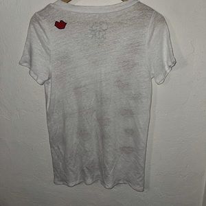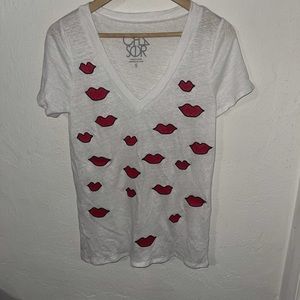 White v neck tee with embroidered lips printed all over, included one on the back.