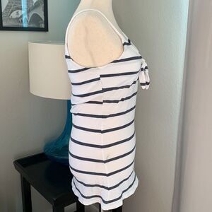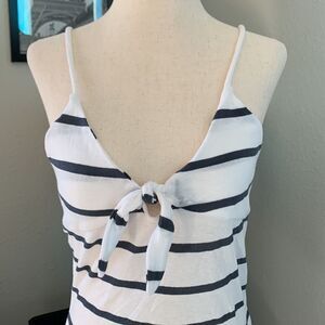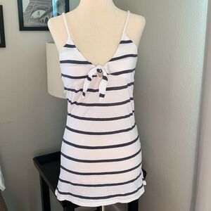 White with navy blue stripes on the soft gauzy cotton material with a knot in front between the bust. Really a cute summer staple!