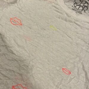 Fun and whimsical white short-sleeve crewneck tee. Features an all-over embroidered lips print in pink and yellow/neon colors. The fabric is lightweight and slightly sheer jersey knit. Perfect for a casual, playful, or minimalist look with a pop of personality.
