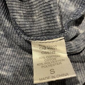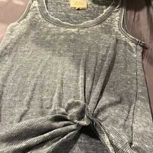 Trendy Blue-Gray Ribbed Tank Top. This stylish sleeveless tank top features a comfortable ribbed knit fabric in a versatile blue-gray hue with a subtle washed or distressed effect. It has a classic crew neck and a removable fashionable knot detail at the front hem, adding a modern touch. Perfect for a casual and chic look!