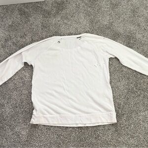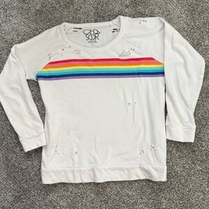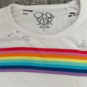 This Chaser sweatshirt features a vibrant retro-inspired rainbow stripe design on a white base,.