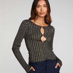 Chaser Black Ribbed Knit Cardigan Top Keyhole Button Closures Gold Lurex Thread