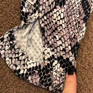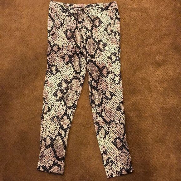 aser Black & White & light brown Python-like Design Pants. Slots on the bottom ankle. Belt loops but also drawstring tie. Two front pockets. Made of viscose and spandex. About 25” inseam. Size S.