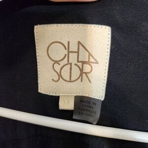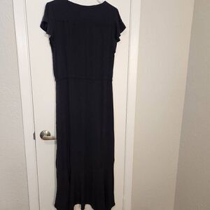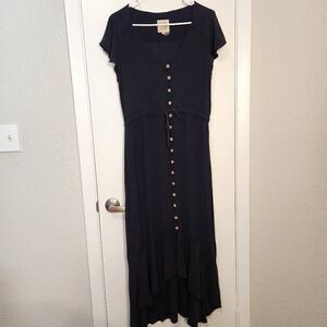 Mottled navy blue button-down flutter sleeve high-low midi dress from Chaser. Super soft. Elastic tie waist.