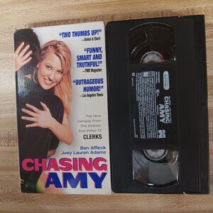 The product is a VHS tape of the 1997 film "Chasing Amy" directed by Kevin Smith and released by Miramax Home Entertainment. Starring Ben Affleck and Joey Lauren Adams, the movie falls under the sub-genres of drama, romance, and cult, with elements of comedy. The VHS includes special features related to its cult status and is in NTSC signal standard for viewing in the United States. This vintage VHS tape is a collectible item for fans of 90s films and Kevin Smith's work.