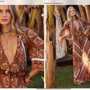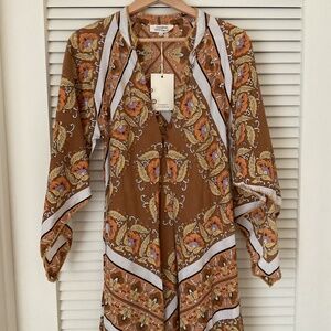 Sold Out! Stunning caftan dress. The white striping really makes it a statement piece. Beautiful colors. Button up front from waist. Fits more small to medium. Flows out from waist down. Wear with or without belt. Lovely both ways. NWT