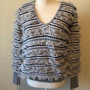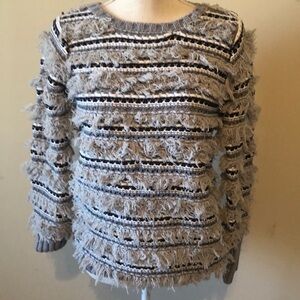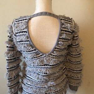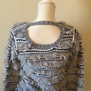 Chasor pullover sweater. Unique shag in gray, with blk and white horizontal weave. Open upper back. No size tag but measurements pictured. NWOT. Chasor sweaters usually retail for 100. Have one of a kind look.