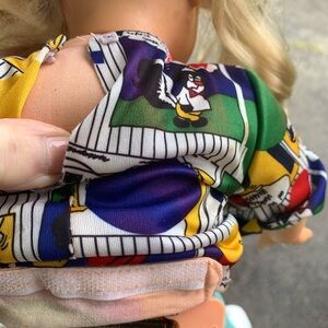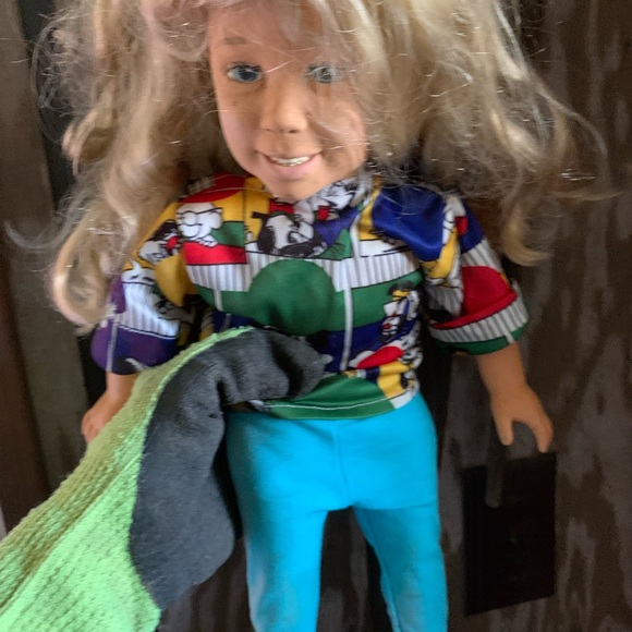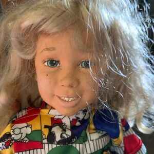 This Chatty Cathy vintage doll,features a colorful outfit and blonde hair, perfect for imaginative play. The doll's bright attire includes shades of blue, green, and red, making it a delightful addition to any toy collection.