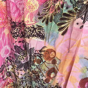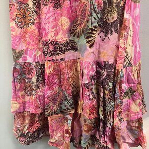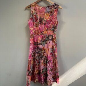 Chaudry Anthro Floral Tiered V-Neck Ruched Cinch Waist Dress Pink Boho NEW Small