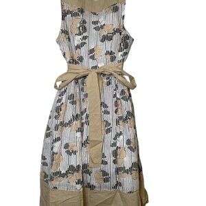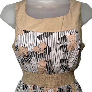 New with tags Chaudry KC dress in size Medium. Crafted from 100% cotton and made in India, this lightweight sleeveless dress features a floral stripe print in neutral tones, a beige color block neckline and hem, and a smocked waist for added stretch and comfort. Includes a matching tie belt at the back for an adjustable fit. Feminine, breathable, and perfect for spring or summer wear.
