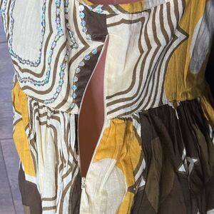 Chaudry KC Mid Century Modern Print Mini Babydoll Sundress in Cream/Brown/Gold. Super cute 70s style print with sequin embellished bust Adjustable straps, lined and hidden side zipper. Very Bohemian and Adorable!!! Size extra sequins come with the dress. Large. Brand new and never worn.