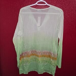 Elevate your wardrobe with this vibrant Chaudry KC Sport long sleeve blouse tunic! Perfect for adding a touch of bohemian flair to your everyday style. This lightweight top features a beautiful blend of green, orange, yellow, and white, making it a versatile piece for various occasions.