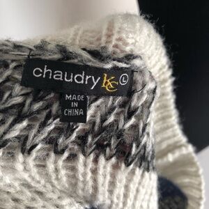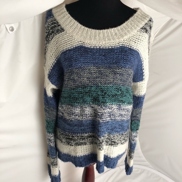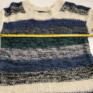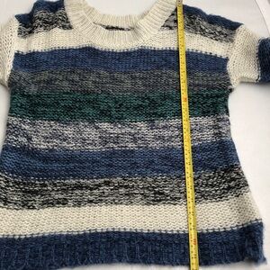 Chaudry KC multicolor blue teal gray black soft striped oversized acrylic sweater. Blue green and gray striped. Essential classic knit for work or weekend! Smoke-free home