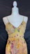 Chaudry KC maxi dress. Beautiful multi-colored pattern, with a yellow base and abstract floral and geometric designs. V-neck, spaghetti straps, a drawstring waist, and a tiered skirt.