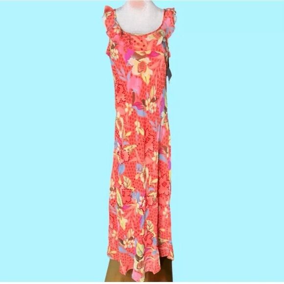 Chaudry KC Tropical Flutter Sleeve/Neck Floral Maxi Dress, Coral SZ Medium. NWT