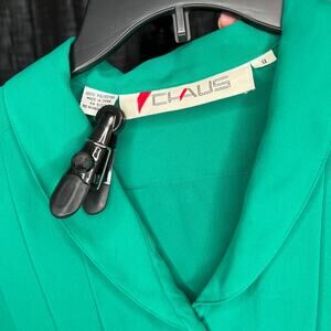 80’s vintage Chaus Kelly green button front blouse. Excellent condition, wide pleated front detail. Rounded collar, fabric covered button front. Shirttail hem. Slight dolman sleeves. 100% polyester, no rips, tears or stains. Approximate measurements pit to pit 19.5”, shoulder to hem 24”, size 8.