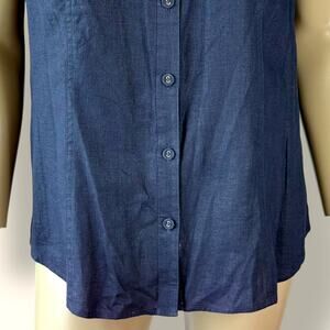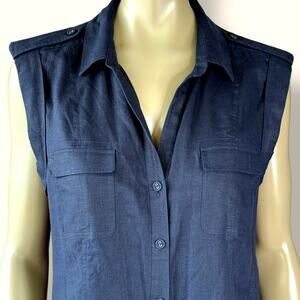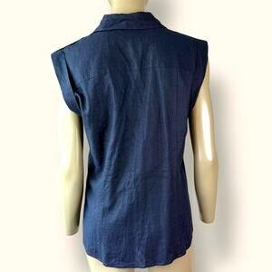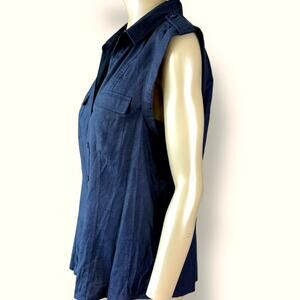 Chaus Linen Blend Cap Roll Sleeve Button Up Top Shirt Pockets Size 16 Dark Navy