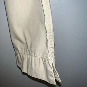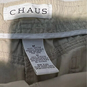 Chaus, M, khaki, crop chino pant with slit hem and elastic waist with a drawstring, front button zip latch, closure, front slant pockets and two rear pockets