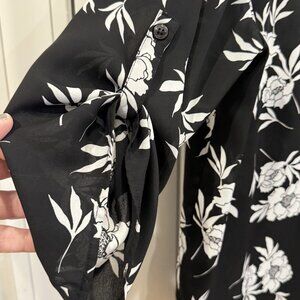 Chaus NY 2xl Black & White Floral Blouse Sheer Roll Tab Sleeves Boho EUC