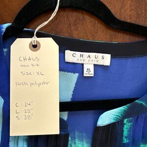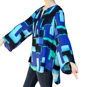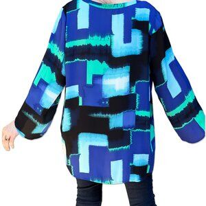 Chaus New York Abstract Print Pleated Tunic Top Blue Green Black Size XL