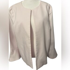 Chaus New York open front long sleeve lined jacket with bell sleeves in pale pink. NWOT Women’s size 10. Beautiful jacket, very dressy & classy. Dry Clean only. Shell 68% cotton 28% poly 4% spandex. Lining 100% poly. P2P 20.5 length 23 sleeve length 22.5 SFPF HOME