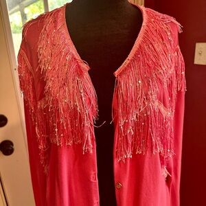 Chaus Pink Fringe Cardigan Sweater XL Sequin Beaded Western Boho Glam Jacket