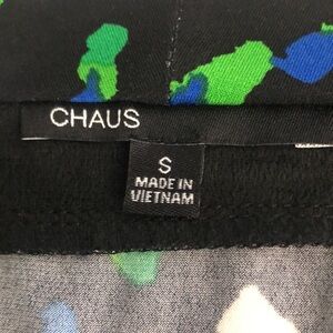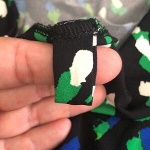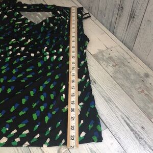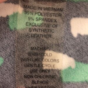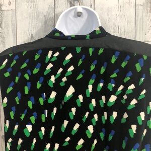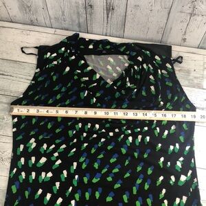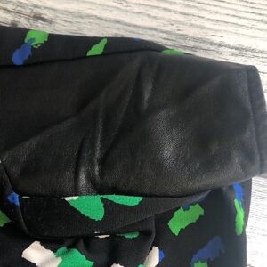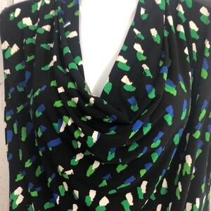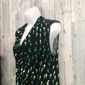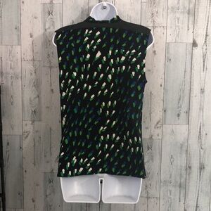 Black with green, blue and white, slouching neck line with weighted center to hold down, sleeveless, synthetic leather on shoulders,colors may vary due to lighting, good used condition, Sz: S