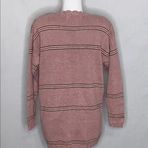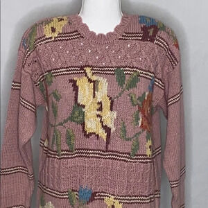 Vintage goodness in good pre-owned condition! This sweater has the shoulder pads intact. It's marked as a small. Mauve color with stripes and knit flowers. Lots of attention to detail with this beauty. Some pilling. Approximate measurements: 20 1/2” bust, 26” length.