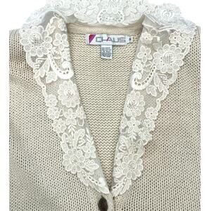 Chaus Vintage Ivory Cream Cardigan Sweater with Embroidered Floral Collar-Small