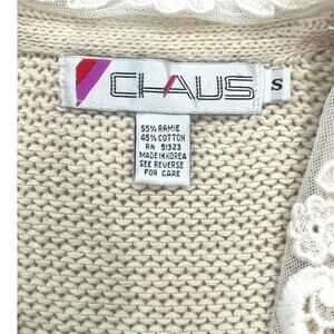 Step back in time with this beautiful Chaus vintage cardigan! This cream-colored sweater features an exquisitely embroidered floral collar, adding a touch of elegance to your outfit. The cardigan is in excellent vintage condition and comes in a women's size small. Perfect for layering or wearing on its own, this vintage cardigan will surely become a favorite in your wardrobe. # 1659