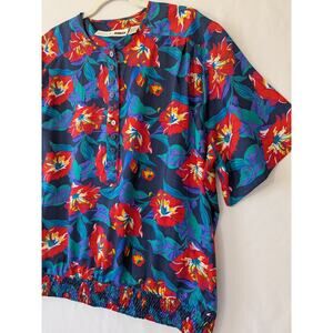 Chaus Woman VTG Hawaiian Floral Blouse 2X Short Sleeve Blue Red Elastic Waist