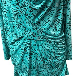 Chaus stretchy cowl neck with rutching on sides, 3/4 sleeves in green with black design. Perfect for any occasion, this top offers a flattering fit and eye-catching design. women’s size XL 95% poly 5% spandex. Machine Wash cold. P2P 21 length 27 sleeve length 18 SFPF HOME