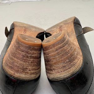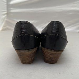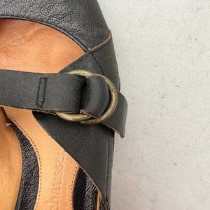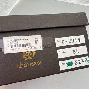 CHAUSSER Black leather pointy toe low heels with a strap across top. Stacked Heel, Comes with box, Size US 6.5.