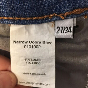 Cheap Monday Narrow Cobra Blue Slim Skinny Jeans Womens 27x34 Medium Denim. Classic 5 pocket design. Button fly closure. 98% Cotton, 2% Elastane. Pre-owned Condition- no flaws, no rips, stains, or holes.