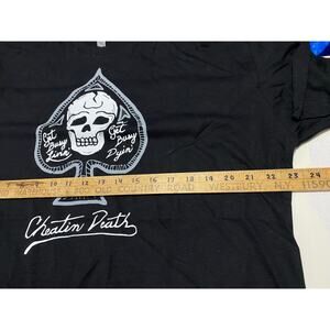 Cheatin Death short sleeve tee in black with bold spade and skull graphic across the chest. Soft cotton blend with clean back and modern fit. Tagged XL, flat lay measurements shown. Pre-owned, excellent condition with no major flaws. Great for streetwear drops, graphic bundles, or Cheatin Death resale.