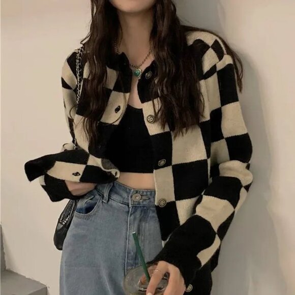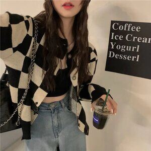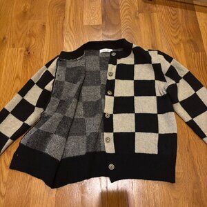 never worn. This attention-grabbing cardigan is patterned with a monochrome checkered design, and features slouchy sleeves and ribbed hems for a relaxed, cozy fit. One size only.