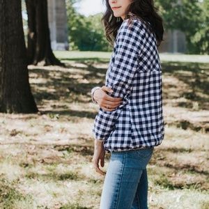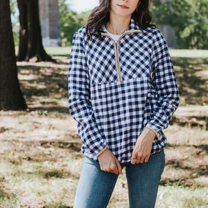 Light flannel pullover with white and navy check. Zipper and sleeve lining/accent is tan.