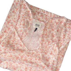 Ditzy Floral Racerback Tank in peachy and pink hues! Slim fit with adjustable spaghetti straps, v-neckline and racerback style rear. Gently worn and in excellent condition, internal brand tag has a strike through from purchasing through retailer; has very slight piling/wash wear that can be seen up close (pictured).