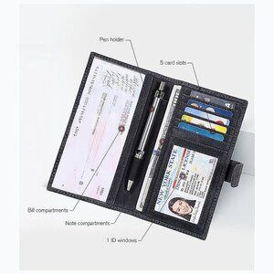 * This leather checkbook cover is both practical and stylish, measuring 6.75 inches by 3.5 inches. It has an open design that closes securely with a loop. Inside, it includes 1 note compartment, 1 ID card slot, 1 pen holder, 5 credit card slots, 1 checkbook holder, and a free divider, keeping everything neatly organized and easy to access.