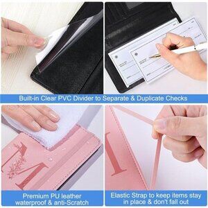 -Functional Practical:The checkbook covers come with 1 checkbook slot,1 clear ID card slot,5 card slots to keep credit cards or business cards,2 large pockets to store receipt,cash,register,bills;A pen holder in the middle to let you always have a pen handy;The built-in clear plastic divider for duplicate checks,elastic band closure to keep items do not fall out