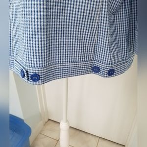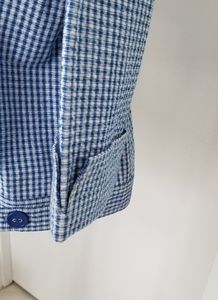 Jacket is blue & white checked, 3/4 sleeve, 4 pocket (2 breast & 2 side slit). Back has 2 double button adjustable tabs.