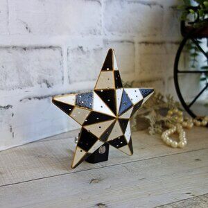Truly a unique and collectible piece, this vintage redesign checked star night light is a must-have accent for farmhouse or checked decor collectors. Crafted from durable metal with an upscale light sensor, this checked light is hand-painted with black and white checkered style pattern and trimmed in a vintage gold to seamlessly blend with courtly styled decor. Measures a generous 5 x 5 inches, making a substantial decorative accent that won't get lost on your wall. Small, uniformly spaced perforations cover the face of the star allowing a beautiful, comforting "starry night" pattern to display in the darkness. Provides a soft, reassuring light perfect for hallways, bedrooms, or any area needing a touch of ambient charm.