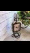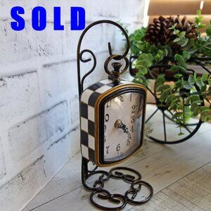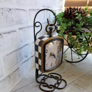 Vintage rehab tabletop clock, black and white checker pattern with open back hangs from gold distressed black ornate iron hanger. 10 in. x 4 in. x 4 in., weight 14 oz. Operates on one AA battery (not included)