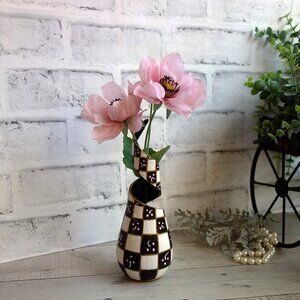 This vintage redesigned vase has a unique swirled, hourglass silhouette that gives the impression of a ribbon wrapping around a core, creating a sense of flowing movement. Hand-painted art in a classic black and off-white checkerboard pattern, gives this piece a bold, high-contrast look with a contrasting playful theme. Nestled within the black squares are tiny, hand painted pink floral accents, a whimsical signature that adds a layer of playful personality to the traditional pattern. The edges of the swirling design are accented with a metallic gold trim creating a sculpture that celebrates creativity and joy. 10.5 x 2.5 in., weight 10 oz.