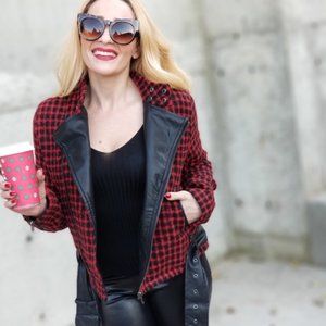Checkered Moto Jacket; Featuring faux leather detailed and collar, zipper pockets, true to size fit and faux leather belt